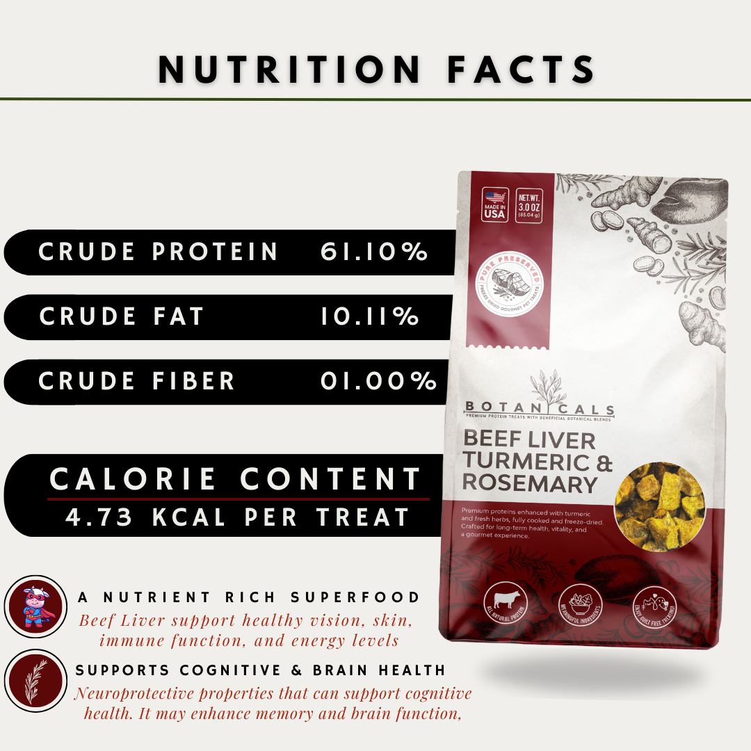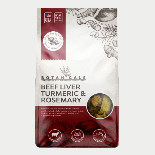 Treat your pet to the best of nature and nutrition with our Beef Liver, Turmeric & Rosemary Treats. Made with premium-quality beef liver, these protein-packed bites are enhanced with turmeric, known for its anti-inflammatory benefits, and rosemary, a natural antioxidant that supports digestion and immunity. Fully cooked and freeze-dried to lock in nutrients and flavor, these treats offer a delicious and wholesome way to promote long-term vitality.